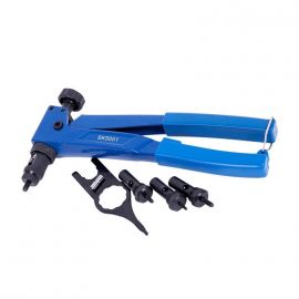 Заклепочник для установки резьбовых заклепок Absolut SK5001 - данный инструмент предназначен для установки резьбовых заклепок диаметром от М3 до М6 из алюминия и стали. Благодаря небольшим габаритам,позволяет устанавливать заклепки в труднодоступных местах. Выполнен из прочной закаленной стали, ручки прорезинены. Поставляется в блистере с насадками и стержнями М3-М4-М5-М6, монтажным ключом. Зарекомендовал себя как недорогой и практичный инструмент, позволяющий решить не большие по объему задачи в установке гаечных заклепок